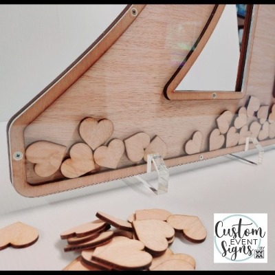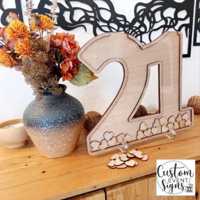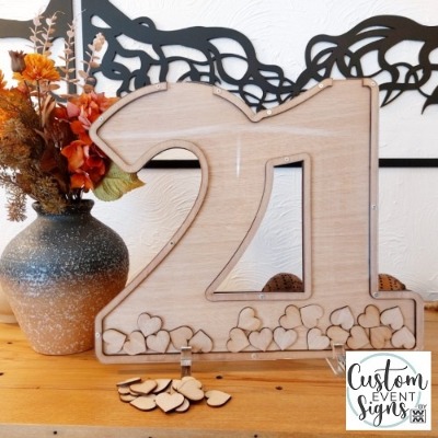 Make your 21st birthday unforgettable with our plywood “21” guest book alternative! This beautifully designed wooden keepsake features a large “21” shape filled with small heart-shaped tokens for guests to sign, leaving heartfelt messages and well wishes. A perfect blend of elegance and creativity, this unique guest book is a stunning centerpiece for your party and a cherished memory for years to come.
